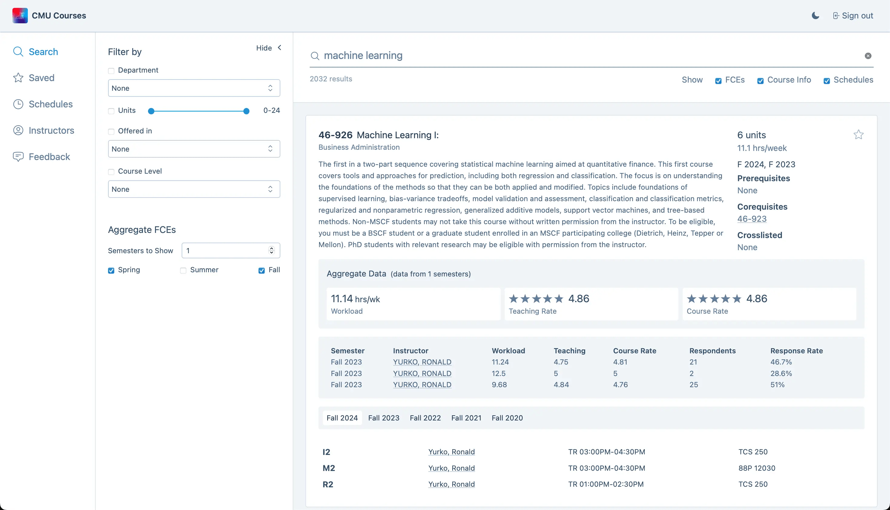 CMU Courses is a course browser built by and for CMU students. Bringing together course information, schedules and FCE data, it makes it possible for CMU students to plan their semesters and browse for courses.